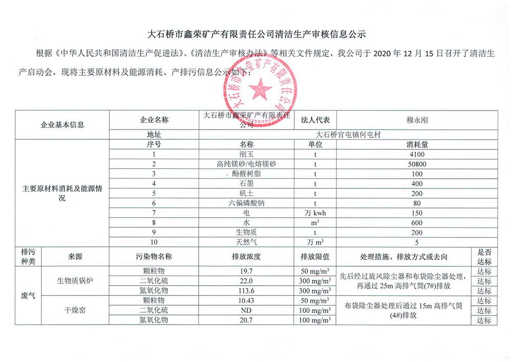 大石橋市鑫榮礦產(chǎn)有限責(zé)任公司清潔生產(chǎn)審核信息(主要污染物排放情況)公示